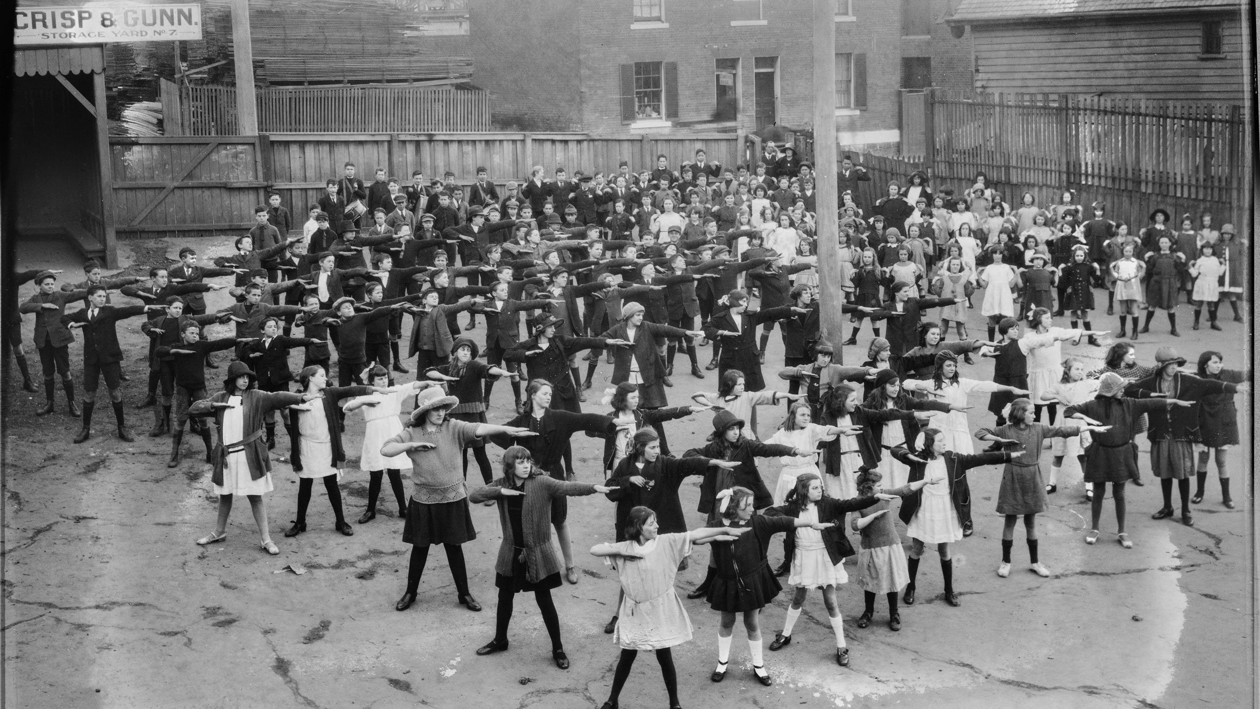 The following two images of children exercising are presented in a single Reveal section, with a fade transition between them.